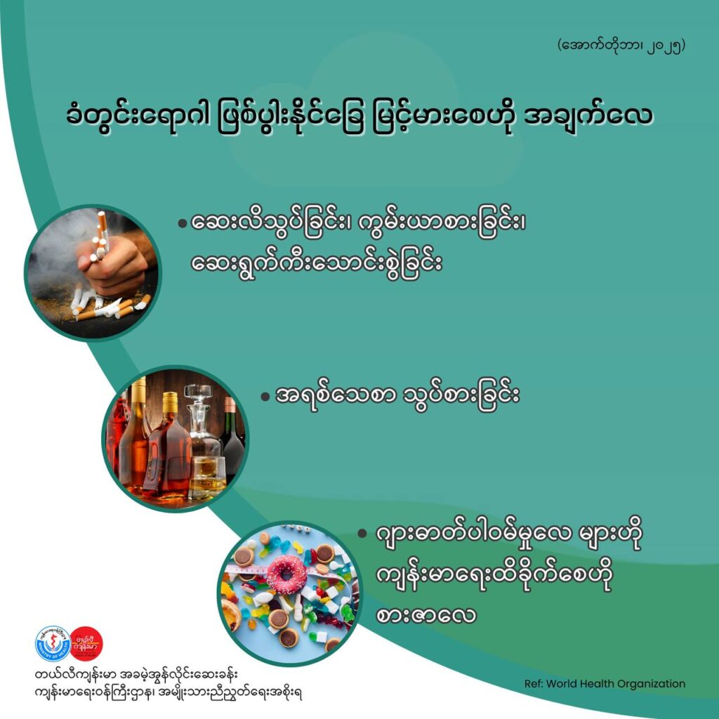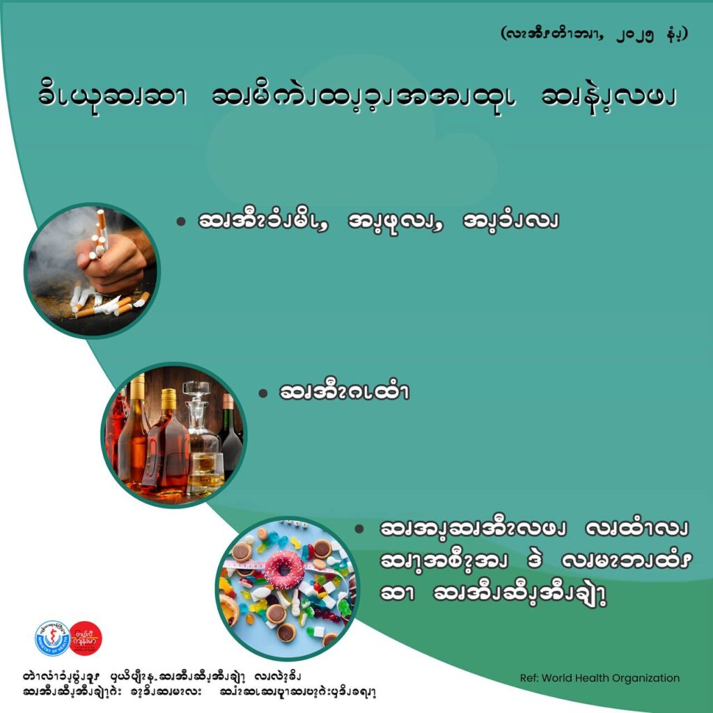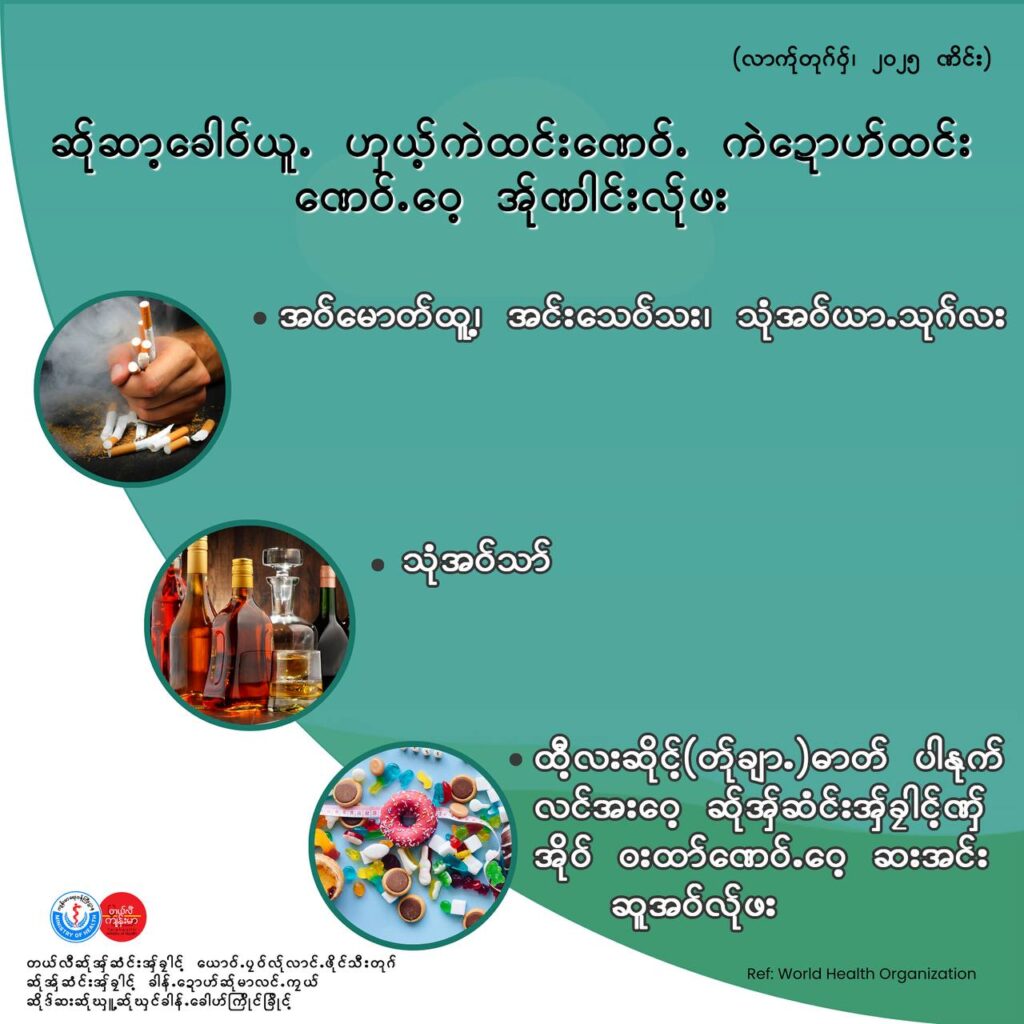 - ဆေးလိပ်သောက်ခြင်း၊ ကွမ်းယာစားခြင်း၊ ဆေးရွက်ကြီး သုံးစွဲခြင်း