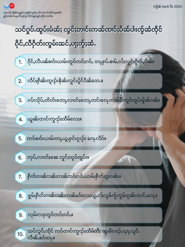 စိတ်ဒဏ်ရာရစေသည့် အဖြစ်အပျက်နှင့် တွေ့ကြုံခဲ့ရလျှင် အောက်ပါတိုကို ဆောင်ရွက်သင့်ပါသည်။