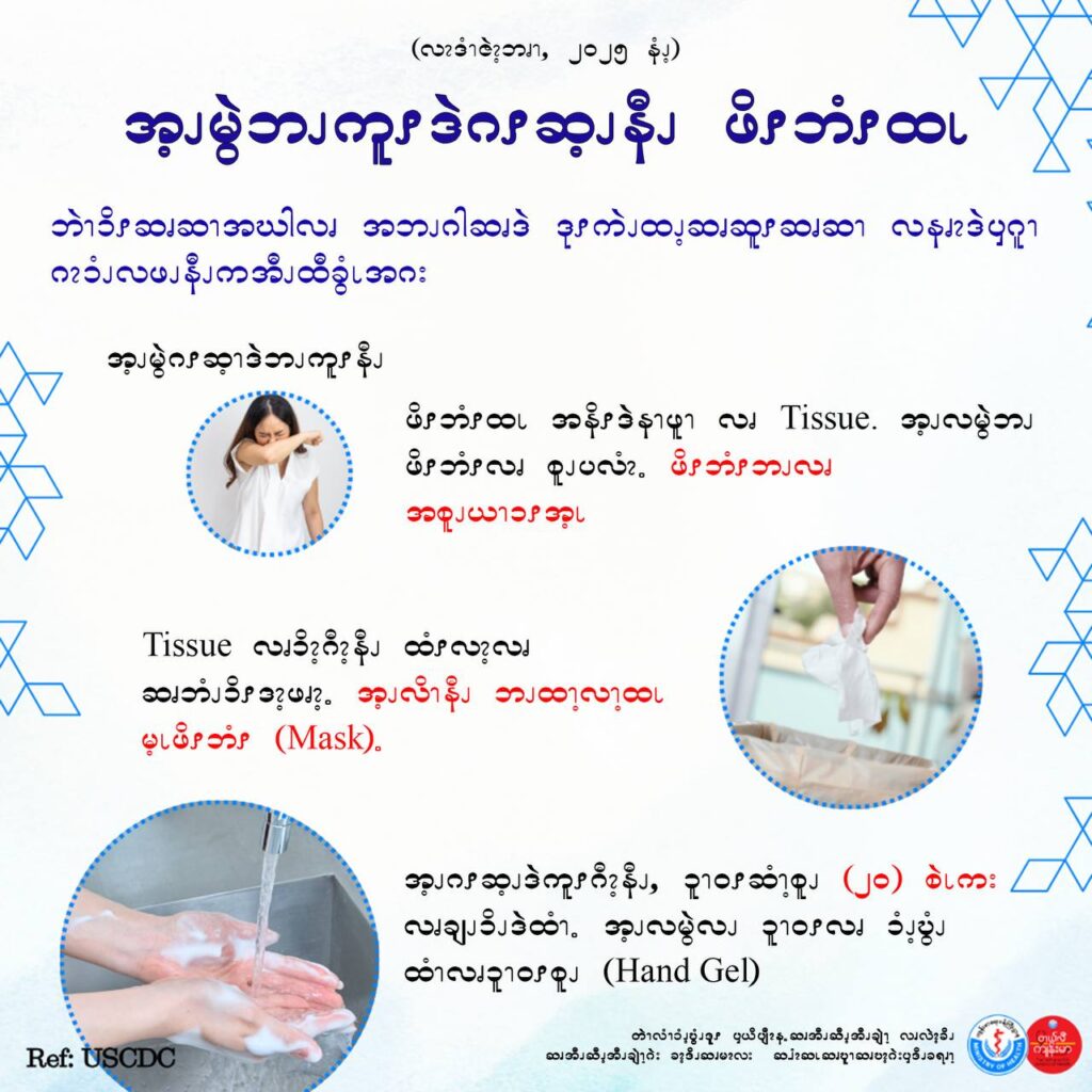 • မိမိ၏ ပါးစပ်နှင့် နှာခေါင်းကို တစ်သျှူးဖြင့် ဖုံးအုပ်ပါ။