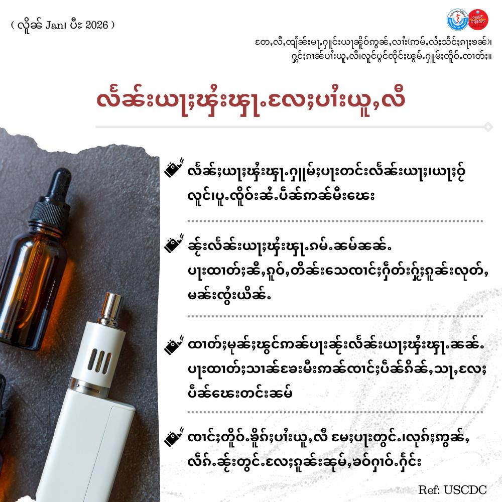 ▪️ အီး-စီးကရက်များ အပါအဝင် ဆေးလိပ်၊ ဆေးရွက်ကြီးနှင့် ကွမ်းယာတို့သည် အန္တရာယ်ရှိသည်။